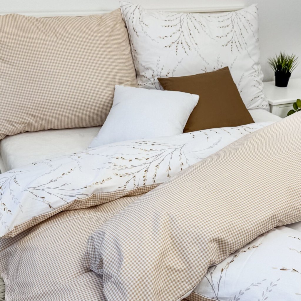 Tancujúce vetvičky vŕby na snehobielom podklade pripomínajú nádej začiatku jari. Vďaka obojstrannému prevedeniu ich ľahko vymeníte alebo skombinujete s kockovaným béžovým vzorom. Hladká 100% bavlna vás každý večer objíme svojou hebkosťou. Tento vzor šijeme len v uvedených veľkostiach, francúzske prevedenie bohužiaľ nie je možné.